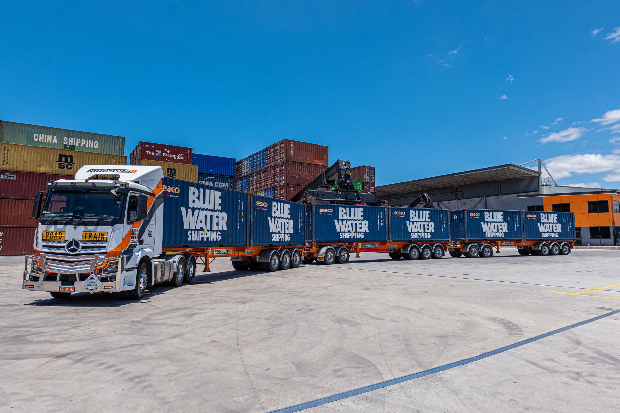 A-triple Road Train combination trial operating in and around the Port of Brisbane using a Mercedes-Benz Actros truck.